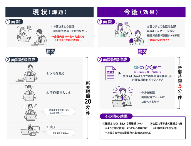 面談記録は、金融機関の営業店行員が金融商品販売時等に作成する文書であり、正確性と迅速性が求められます。従来、この作業には1件あたり約20分を要していましたが、GaiXerの導入により、作成時間を約5分へ短縮できる見込みです。これにより、行員の業務効率が向上し、より質の高い顧客サービスの提供が可能となります。