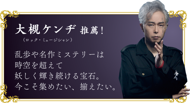 幼いころから江戸川乱歩や名作ミステリーが大好きだったというロック・ミュージシャンの大槻ケンヂさんが、本シリーズを推薦しています。また、2/14(火)より大槻ケンヂさんが主演する本シリーズのテレビCMが放映されます。「ミステリーの案内人」役を演じる大槻ケンヂさんをぜひご覧ください!