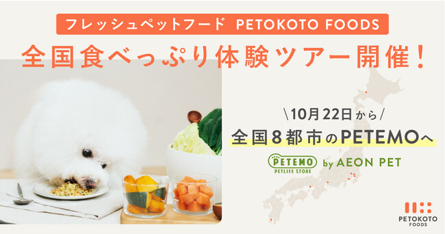 ペットウェルネス事業を展開する株式会社PETOKOTOは、フレッシュペットフード「PETOKOTO FOODS(ペトコトフーズ)」を愛犬とお試しいただける「食べっぷり体験ツアー」を、イオンペットが運営する全国のPETEMO(ペテモ)8店舗にて10月22日(土)より順次開催します。会場では全メニューを無料でご試食いただけます。