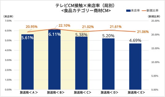 分析1.とあわせ、テレビCMに接触した曜日・時間帯別の来店率、および放送局別の来店率計測も行いました。これにより、テレビCM放映時間帯ごとの来店寄与度や、放送局別の来店寄与度が明らかになりました。