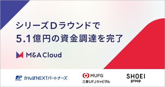 株式会社M&Aクラウド(本社:東京都千代田区、代表取締役CEO:及川厚博、以下「当社」)は、かんぽNEXTパートナーズ株式会社、正栄産業株式会社、三菱UFJキャピタル株式会社等(五十音順)から、シリーズDラウンドとして総額約5.1億円の資金調達を実施したことをお知らせいたします。今後、M&A事業者が当社プラットフォームをより便利に活用いただくためのシステム開発や、M&Aアドバイザーの採用強化を図ってまいります。