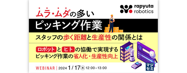 クラウドロボティクスプラットフォームを提供するラピュタロボティクス株式会社(東京都江東区、代表取締役 CEO:モーハナラージャー・ガジャン、以下ラピュタロボティクス)は、1月17日(水)に無料オンラインセミナー「ムラ・ムダの多いピッキング作業 スタッフの歩く距離と生産性の関係とは」を開催いたします。