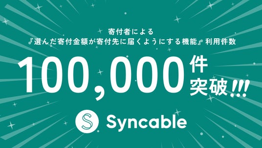 新しい寄付の形を作り出すことで民間の社会保障を拡大する寄付決済プラットフォームSyncableを運営する株式会社STYZ(東京都渋谷区、代表取締役社長:田中 辰也)は、決済プラットフォーム業界初の寄付者による『寄付金額100%寄付先に届くようにする機能』利用件数が10万件を突破したことを発表いたします。これからもSyncableを通じて、寄付者の体験をより自由なものとし、より多くの寄付を届けることができるよう、さらなる機能の開発・実装を目指してまいります。