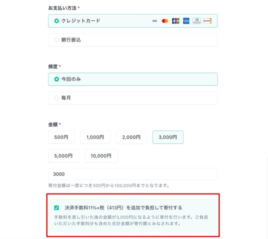 Syncableの決済手数料は5%となっていますが、寄付者の皆様より「希望する金額の寄付を100%とどけたい」というニーズがありました。これに答えるべく、Syncable決済手数料5%を寄付者が肩代わりできる機能を2021年2月に実装いたしました。