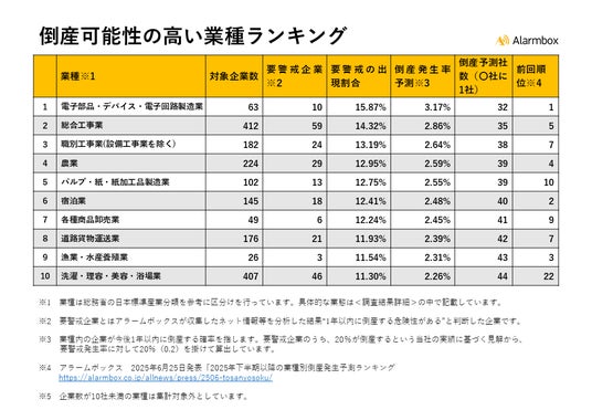 AI与信管理サービスを提供するアラームボックス株式会社(本社:東京都新宿区、代表取締役:武田浩和、以下「当社」)は、この度、2024年12月1日~2025年11月30日の期間に収集された14,143社・255,755件のネット情報等から1年以内に倒産する危険性がある“要警戒企業”を分析・抽出し、「倒産危険度の高い上位10業種」を予測しましたので発表します。