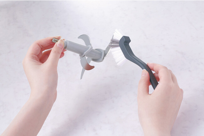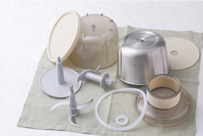 2つのボウルは重ねて、コンパクトに収納が可能。狭いキッチンでも省スペースでOKです。本体以外は全て丸洗いできるので、すみずみまで清潔に。洗いにくい[ブレード]をしっかり洗えるお手入れブラシ付きです。