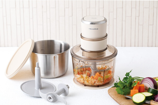 さらに、軽量で中身が見えて扱いやすい[クリアボウル]、丈夫でにおい移りがしづらい[ステンレスボウル]の2種のボウルが付属するので、野菜や肉などの食材や、レシピに応じて使い分けが可能。刻んだ食材の一時保存にも便利なフタ付き。