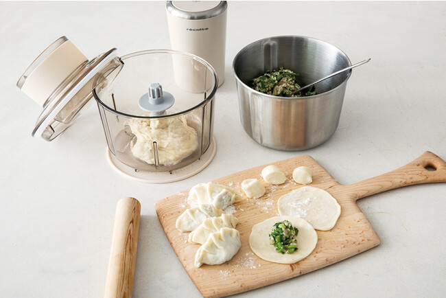 たねを作るだけではなく、生地をこねて皮から作る餃子は[フードプロセッサー コンボ]の本領が発揮されるレシピのひとつ。[クリアボウル]で皮の材料を入れてこね、[ステンレスボウル]に、たねの材料を入れて刻み混ぜます。ニラやにんにくなどは、におい移りが気になるものですが、素材がステンレスなので心配なし!いちから手作りする餃子は格別のおいしさ。家族や友人とも一緒に作るのも楽しいものです。