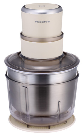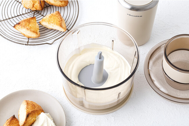 [泡立てパーツ]は、セットした時に円形のプレートが少し斜めになっているのがポイント。しっかりと空気を含ませて、素早くキレイに泡立てができます。セットしたら、あとはボタンを押すだけなので、腕が疲れることもありません。生クリームなら200~600mlまで泡立てられるので、多人数のおもてなしにも◎