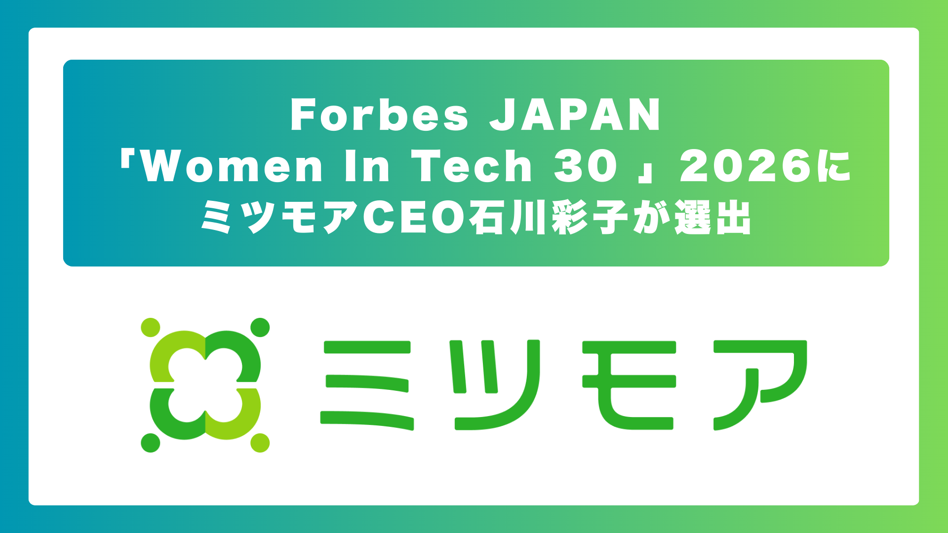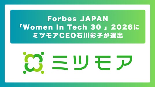 株式会社ミツモア(本社:東京都中央区、代表取締役CEO:石川彩子)は、代表取締役CEOの石川彩子が、Forbes JAPANが選出する「Women In Tech 30 」2026に選出されたことをお知らせします。