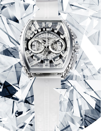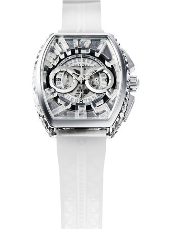 カラーリングによってイメージががらりと変わるのもピラミッドの特徴です。ホワイトのストラップには、3Dインデックスが宙に浮かび上がるように見えるようにフルスケルトンの文字盤を組み合わせました。ケースサイドのクルー・ド・パリが、光を透過したり反射したり、さまざまな表情を生み出します。
