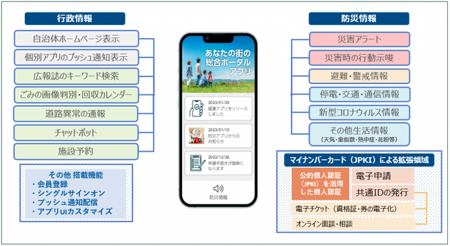 自治体が住民に発信する情報・既存アプリ・Webサービス等を集約・一元化し、住民への情報発信力を格段に高めるアプリケーションです。既存アプリやWebサービスとのAPI接続によりシングルサインオンを実現し、住民の利便性が格段に向上することに加え、PUSH通知の統合などの管理機能により自治体職員の業務負担軽減も実現します。
