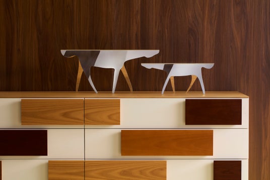 CAVALLO(馬)は、一枚の金属板をシンプルに折り曲げることで生まれた、折り紙のような造形のオブジェです。魔法のように命を吹き込まれたそのフォルムは、平らな素材を芸術へと昇華させるジオ・ポンティの卓越した才能を象徴しています。現在はステンレススチールで復刻されており、光沢のある質感が動物の躍動感を鮮やかに描き出します。
