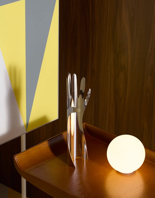 イタリア語で“手”を意味する LA MANO は、ジオ・ポンティと銀細工師リノ・サバッティーニとの遊び心ある対話から誕生しました。湾曲させた一枚の金属板から、6本の予期せぬ、どこか可笑しみを帯びた指が立ち上がる大胆なデザインが際立ちます。現在はステンレススチールで復刻され、空間を彩るオブジェとしてはもちろん、ジュエリースタンドとしても機能します。