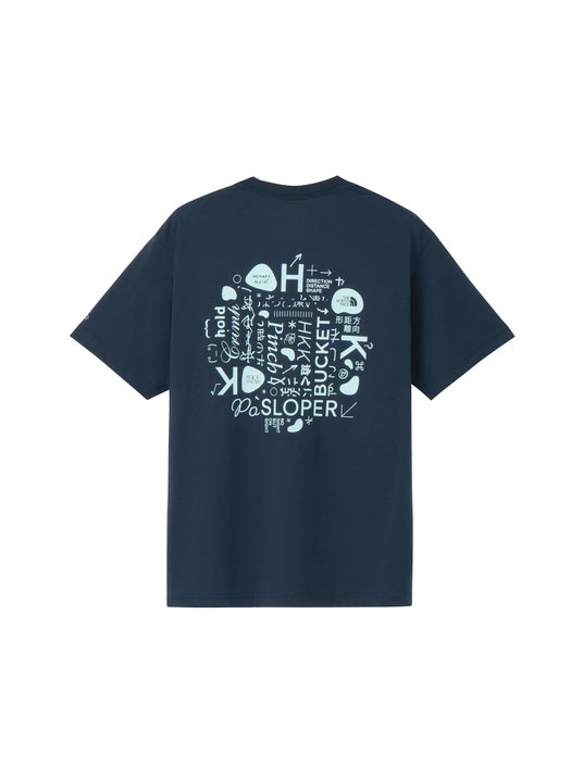 HKKに関する漢字や英語の表記に加え、矢印などの記号、ホールドの形状や掴み方(スローパー、ピンチなど)がアルファベットで書かれています。デザインで使用されているフォント(文字の種類)も様々で、「すこし左」「2時の方」の言葉も見え隠れしています。パートナーとの声の掛け合いが重なり合い、目の前の壁に挑んでいく様子を表現したグラフィックです。