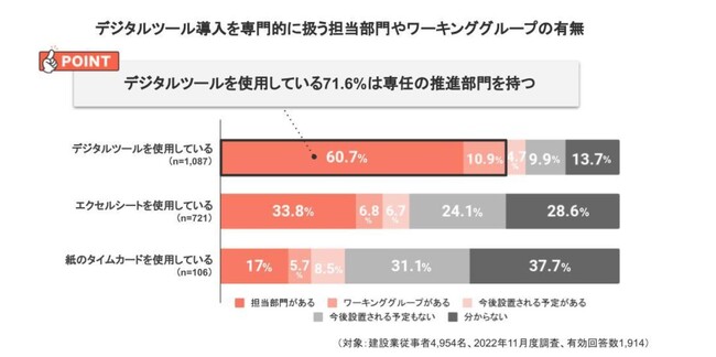 勤怠管理にデジタルツールを使用しているグループ(デジタルグループ)、エクセルシートの入力を行なうグループ(Excelグループ)、紙のタイムカードを使用するグループ(紙グループ)の間で、デジタルツール導入を専門に扱う担当部門やワーキンググループの有無に違いがあるかを調べたところ、デジタルグループの71.6%が、担当部門またはワーキンググループがあると回答しました。一方で、Excelグループとタイムカードグループでは、「今後設置される予定もない」、「分からない」と回答した回答者が半数以上を占める結果となりました。