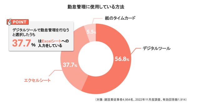 勤怠管理にデジタルツールを使用している、と選択した回答者に方法の内訳を聞いてみたところ、37.7%がExcelシートへの入力を選択していました。