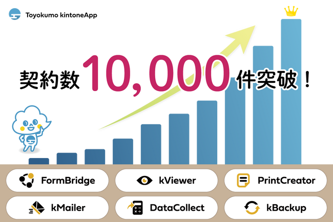 トヨクモ株式会社(本社:東京都品川区、代表取締役社長:山本 裕次、以下トヨクモ)は、サイボウズ株式会社(本社:東京都中央区、社長:青野 慶久、以下サイボウズ)が提供する業務改善プラットフォームである「kintone」の連携サービス「Toyokumo kintoneApp(FormBridge、kViewer、PrintCreator、kMailer、DataCollect、kBackup)」が6製品合計で10,000契約を突破したことをお知らせいたします。