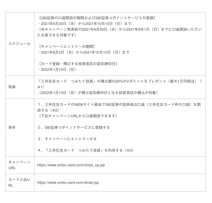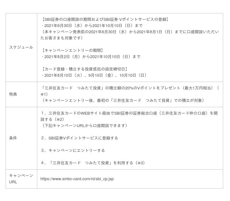 (※1)本キャンペーンにより付与される20%のVポイントには、通常0.5%の付与率で付与されるVポイントのほか、最大2.0%のVポイントが貯まる「つみたて投資ポイントアッププラン」の条件を満たした場合に付与されるVポイントを含むものとして取り扱います(ポイント付与は最大20%まで)。つみたて投資ポイントアッププランについてはこちら(https://www.smbc-card.com/mem/for_sbi/plan/pop/index.jsp)