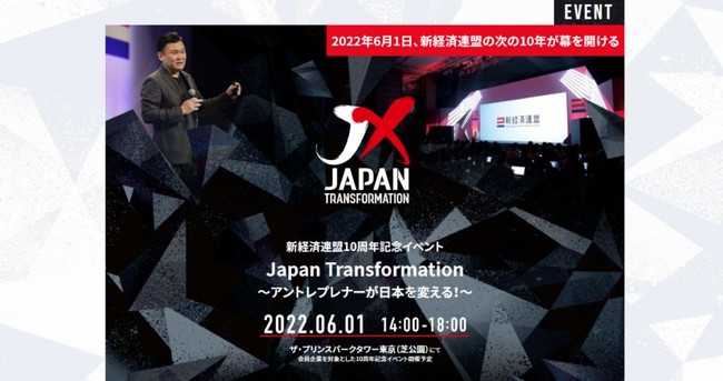 2022年6月1日、一般社団法人新経済連盟(所在地:東京都港区、代表理事:三木谷 浩史、以下「新経連」)は10周年記念イベント「Japan Transformation~アントレプレナーが日本を変える!~」を開催します。また、開催に先立ちイベントへの参加お申込受付を開始しましたのでお知らせします。