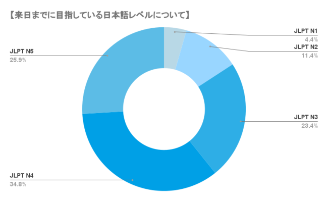 来日までに目指している「日本語能力試験のレベル」について聞いたところ、最も多いのは「JLPT N4(34.8%)」、次に「JLPT N5(25.9%)」という回答になりました。