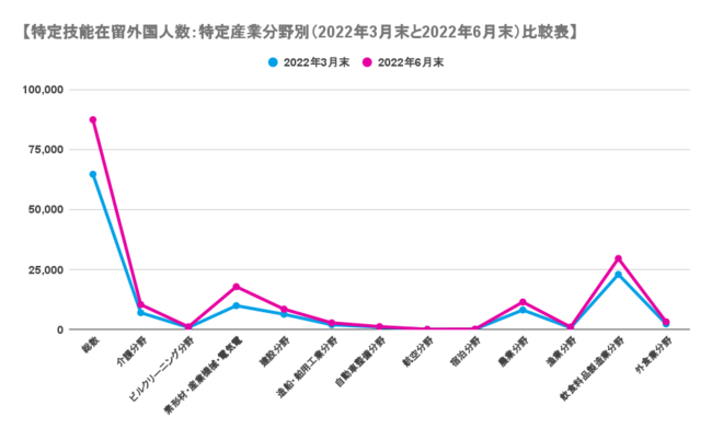 また、特定技能の全体の人数は年々増加しており、2022年3月末時点では、64,730名が滞在。同年6月末時点では87,471名と2か月で約2万人増加しています。(*1)しかし、産業分野別にみると宿泊分野の人数は2022年3月末時点では124名、同年6月末時点では、160名と増加はしているものの他の産業分野と比較すると、活用が進んでいないことがわかります。