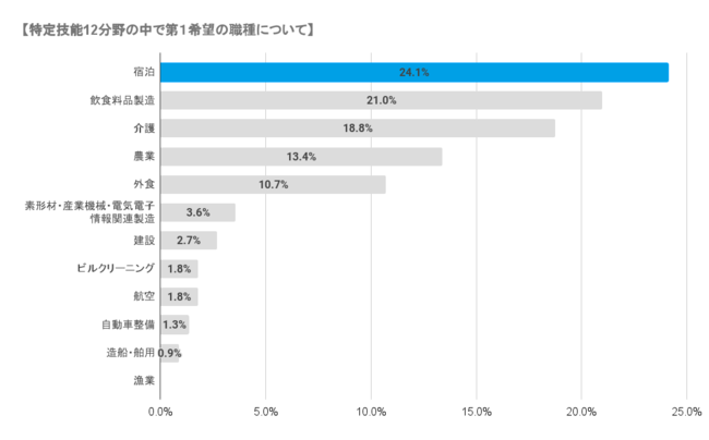 日本での就業を目指している外国人に、特定技能12分野の中で第1希望の職種を聞いたところ、最も多い職種は「宿泊(24.1%)」、次いで「飲食料品製造(21.0%)」、「介護(18.8%)」という結果になりました。