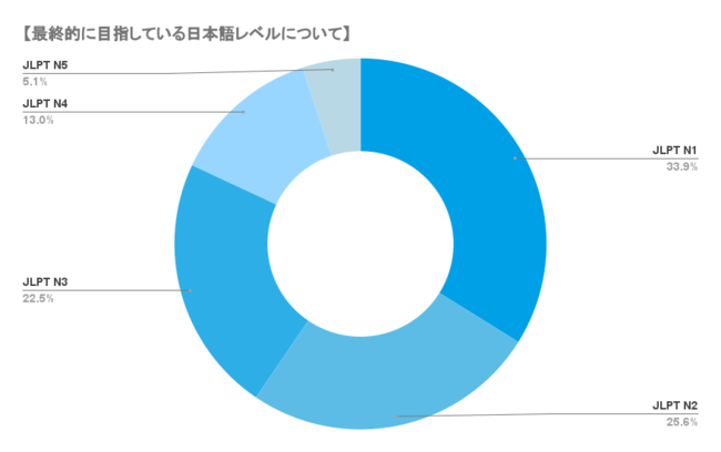最終的に目指す「日本語能力試験のレベル」について、聞いたところ最も多いのは、「JLPT N1(33.9%)」、次いで「JLPT N2(25.6%)」ということがわかりました。JLPT N1は、幅広い場面で使われる日本語を理解することができるとして、最も難易度が高いとされており、平均合格率は30%です。