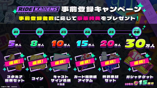 『ライドカメンズ』では最終的な事前登録者数に応じて、アプリ内でのゲームプレイに役立つ豪華アイテムを、本アプリのプレイヤー全員にプレゼントする「事前登録キャンペーン」を実施。