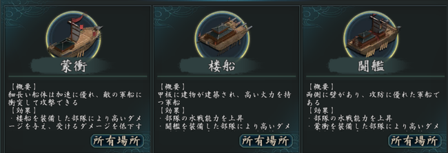 軍船は蒙衝、楼船、闘艦の三種類があり、それぞれ相性が存在します。より巧妙に布陣を設定し、他の君主を圧倒しましょう。