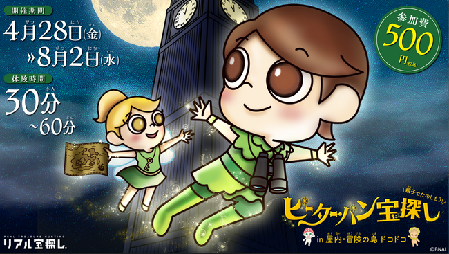 体験型コンテンツ「リアル宝探し」の企画・制作・運営を手がける株式会社タカラッシュ(本社:東京都品川区、代表取締役:齊藤 多可志、以下タカラッシュ)は、世界中で愛され続けているブロードウェイミュージカル『ピーター・パン』とコラボレーションした親子で楽しめるリアル宝探しイベント「ピーター・パン宝探し」を「屋内・冒険の島 ドコドコ」(東京都立川市)にて4月28日(金)より実施いたします。