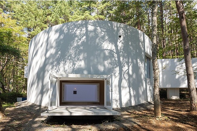 妹島和世建築設計事務所が1994年に設計した個人邸を現オーナーの協力のもと「蓼科の森の家」の呼称でレジデンス会場として利用しています。深い森に覆われた山の中に佇み、白く塗られたファサードには樹々の影が写り込み、内部のアトリエは自然光あふれる開放的な空間となっています。今後、定期的に芸術家のための創作の場として活用していく予定です。