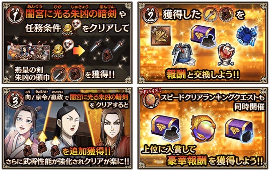 開催中のイベント『朱凶 襲来』のイベントクエストに、『向』『京令』『嬴政』を編成すると、交換用アイテムが追加でドロップ!報酬アイテムへの交換が容易になります!