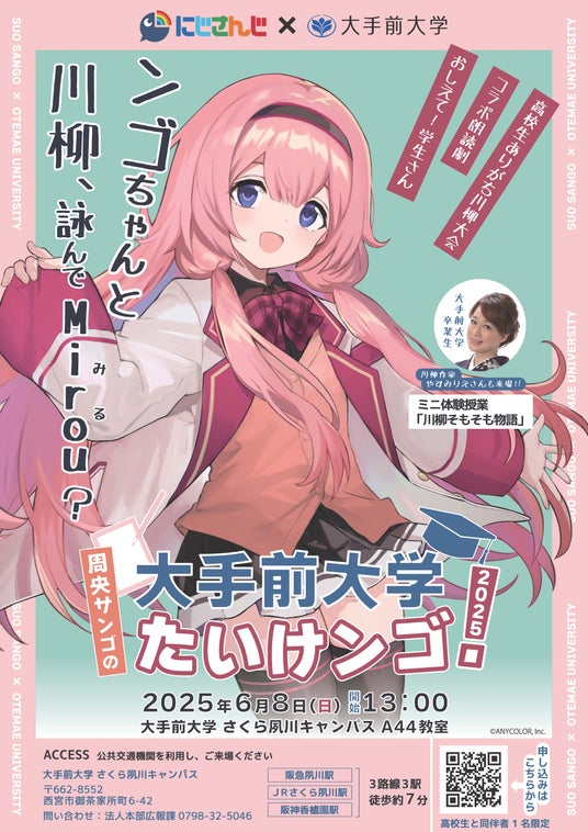 大手前大学は6月8日(日)、ANYCOLOR株式会社(本社:東京都港区)が運営するVTuber/バーチャルライバーグループ・にじさんじ、と高校生を対象にしたコラボ企画を昨年に引き続き、さくら夙川キャンパスで実施します。