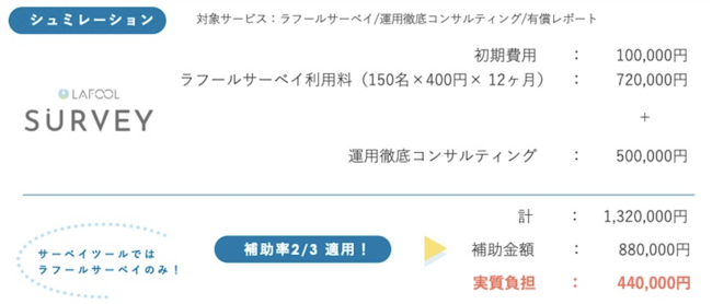 導入支援事業者採択により、補助金対象の企業様が『ラフールサーベイ』を導入される場合、導入費用(初期費用と月額費用1年分などの合計額)の最大2/3(最大150万円)の補助金が支給されます。