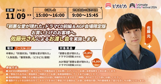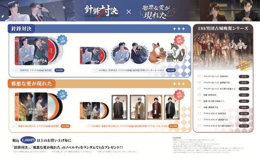 - 参加条件:対象商品販売時間に上記ブースにて販売される「邪悪な愛が現れた」、「針鋒対決」の各ドラマCD前編「通常盤」またはドラマCD前編「AGF会場限定版」を購入された方