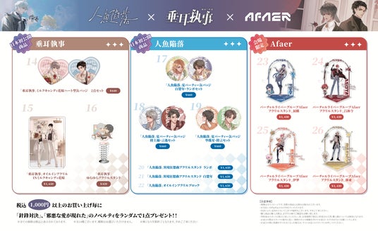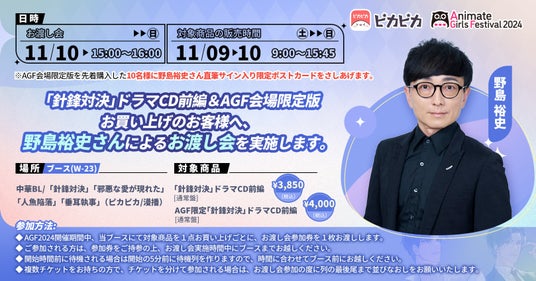 - 参加方法(2作品共通):AGF2024開催期間中、当該ブースにて対象商品を1点お買い上げごとに、お渡し会参加券を1枚お渡しします。お渡し会参加券を持参の上、実施時間中にブースまでお越しください。待機列はお渡し会開始の5分前に形成します。時間に合わせてブース前にお越しください。(※複数チケットをお持ちの方で、チケットを分けて参加される場合は、お渡し会参加毎に列の最後尾へ並び直し、周囲の方へのご配慮をお願いします。)