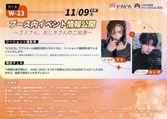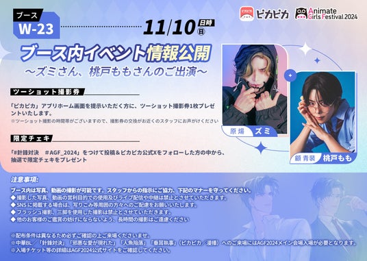 夢の光株式会社の運営する音声コミュニティーアプリ「ピカピカ」が、2024年11月9日(土)~11月10日(日)に開催される【アニメイトガールズフェスティバル 2024】に参加決定。今回の出展では、大人気中華BL作品『針鋒対決』『邪悪な愛が現れた』の日本語ボイスドラマがAGF2024に初出展します。それを記念して、AGF2024の会場のブースにて、人気声優野島裕史さん、佐藤元さんによるお渡し会が開催されます。そして、人気コスプレイヤーズミさん、おじきさん、桃戸ももさんによる撮影コーナーイベントもブース内で開催される予定です。本文の詳細を参照の上、ぜひ会場に来て楽しんでください!