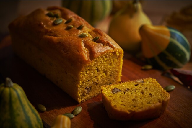 かぼちゃのペーストを練り込んだしっとりした生地にパンプキンシードを乗せ焼き上げ、仕上げにメープルシロップを染み込ませました。アクセントにくるみを使用しています。
