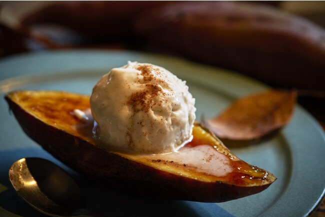 低温でじっくり焼き上げたさつまいものローストにプラントベースのバニラアイスクリームをトッピングしました。