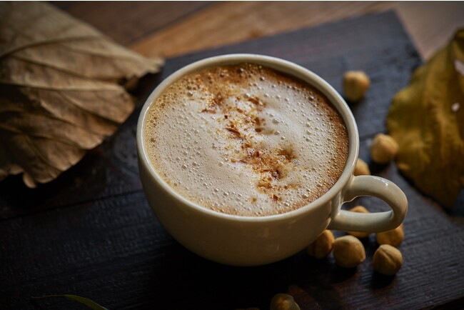 ヘーゼルナッツのシロップと、ローストしたナッツをトッピングした甘くてほろ苦いラテです。