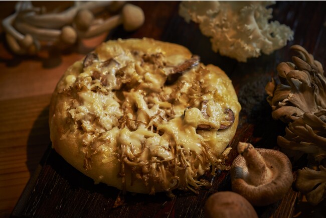 フォカッチャ生地に4種のきのこを乗せ焼き上げ、仕上げにプラントベースのチーズソースをトッピングしました。