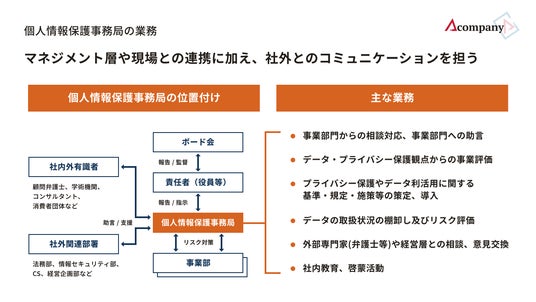 個人情報保護事務局は、事業者におけるデータ活用とプライバシー保護の両立を牽引する役割を担い、主な業務として、個人情報の管理、データ活用施策に伴うリスク・課題への対応、さらには社外とのコミュニケーションなどが挙げられます。これらの業務は、専門の事務局が担うケースだけでなく、情報セキュリティ部、法務部などが担うケースも多いです。