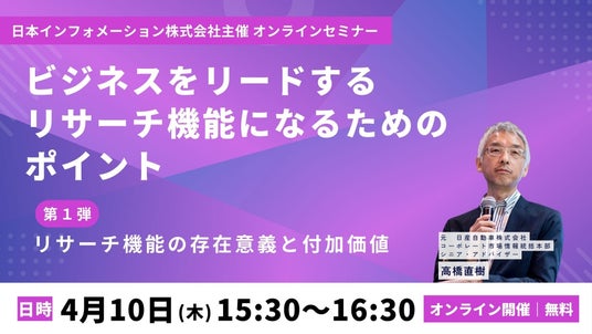 総合マーケティングリサーチ会社の日本インフォメーション株式会社(本社:東京都中央区、代表取締役社長:斎藤啓太)は、2025年4月10日(木)15:30より元日産自動車株式会社の高橋氏を講師にお迎えして、無料オンラインセミナーを開催します。