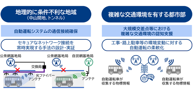 地域交通の持続性確保にも資する、自動運転技術に対する期待が高まっています。政府の「デジタル田園都市国家構想総合戦略」でも、地域限定型のレベル4自動運転移動サービス(以下 自動運転サービス)※の全国展開・実装を目指しています。自動運転サービスの社会実装のためには、遠隔監視システム等の通信システムが不可欠です。社会実証による通信システムの要件の検証は急務であり、政府の「デジタル田園都市国家インフラ整備計画」に位置づけられています。