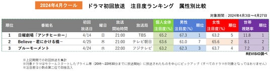 ご家庭に人体認識技術を搭載した機器を設置し、テレビスクリーンへの「注視」を測るREVISIO株式会社(本社:東京都千代田区、代表取締役社長 郡谷康士、以下REVISIO)は、2024年4月にスタートした春ドラマについて、初回放送での注目度ランキングTOP3を作成し、人気の傾向を分析致しました。注目度が高いとは、テレビの前の視聴者がくぎづけになっていたことを表します。