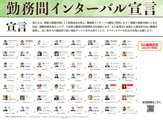 本宣言は、勤務終了時間から翌日の勤務開始時間までに11時間の休息を確保する勤務間インターバルの制度導入に賛同する企業や自治体などを2022年3月から当社が募集、56社(※2) が賛同しています。