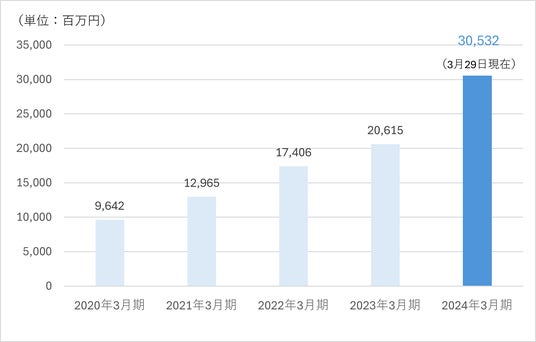 資産運用・投資に対する関心の高まりを受け、当社が仲介する金融商品預かり資産残高における前年度伸展は過去最大。2024年3月末時点で305億3,297万円となりました。