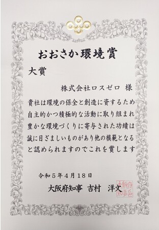 もったいない食品を活かし、エシカルな消費スタイルを創造する株式会社ロスゼロ(大阪市西区、代表 文美月)は令和4年度「おおさか環境賞」大賞を受賞し、4月18日に執り行われた表彰式に出席致しました。式では吉村洋文大阪府知事より表彰状を受け、懇談にて大阪・関西万博に向けた食品ロス対策をお聞きしました。
