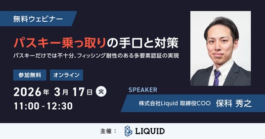 ELEMENTSグループの株式会社Liquid(本社:東京都中央区、代表取締役:長谷川 敬起)は、2026年3月17日(火)に、「パスキー乗っ取りの手口と対策」をテーマにしたウェビナーを開催します。現在、各サービスのログイン時に、顔・指紋・PINを利用したパスワードレスの当人認証手段として、「パスキー」が普及しています。しかしその一方で、eSIM再発行の悪用によるSIM乗っ取りが、日本でも現実の脅威になっています。本ウェビナーでは、当社取締役最高執行責任者(COO)の 保科 秀之(ほしな・ひでゆき)が、いま問題となっているSIM乗っ取りの手口や被害の大きさ、認証シーン別に応じたフィッシング耐性MFA(多要素認証)の設計方法について、詳しく解説いたします。
